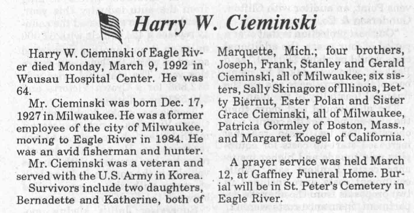| Cieminski | Harry W | 17 Dec 1927 | 09 Mar 1992 | V N-R | 18 Mar 1992 | 4 |