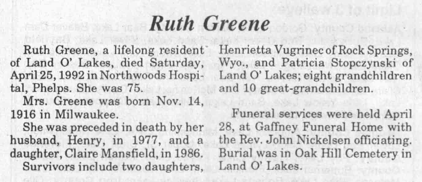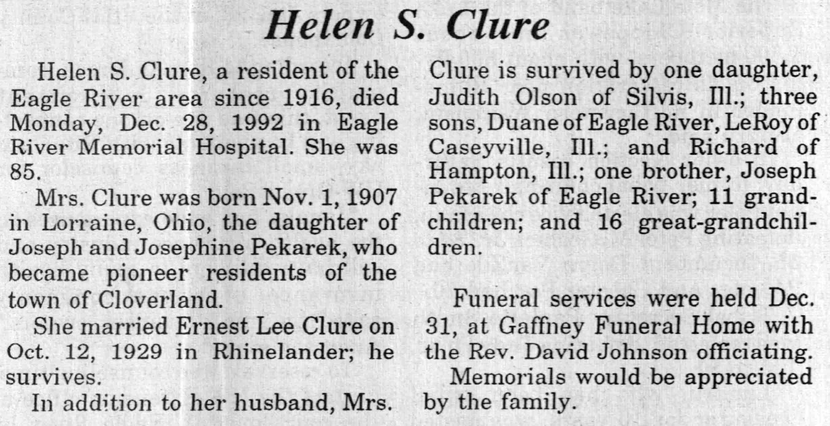 | Clure | Helen S (Peckarek) #2 | 01 Nov 1907 | 28 Dec 1992 | V N-R | 06 Jan 1993 | 4 |