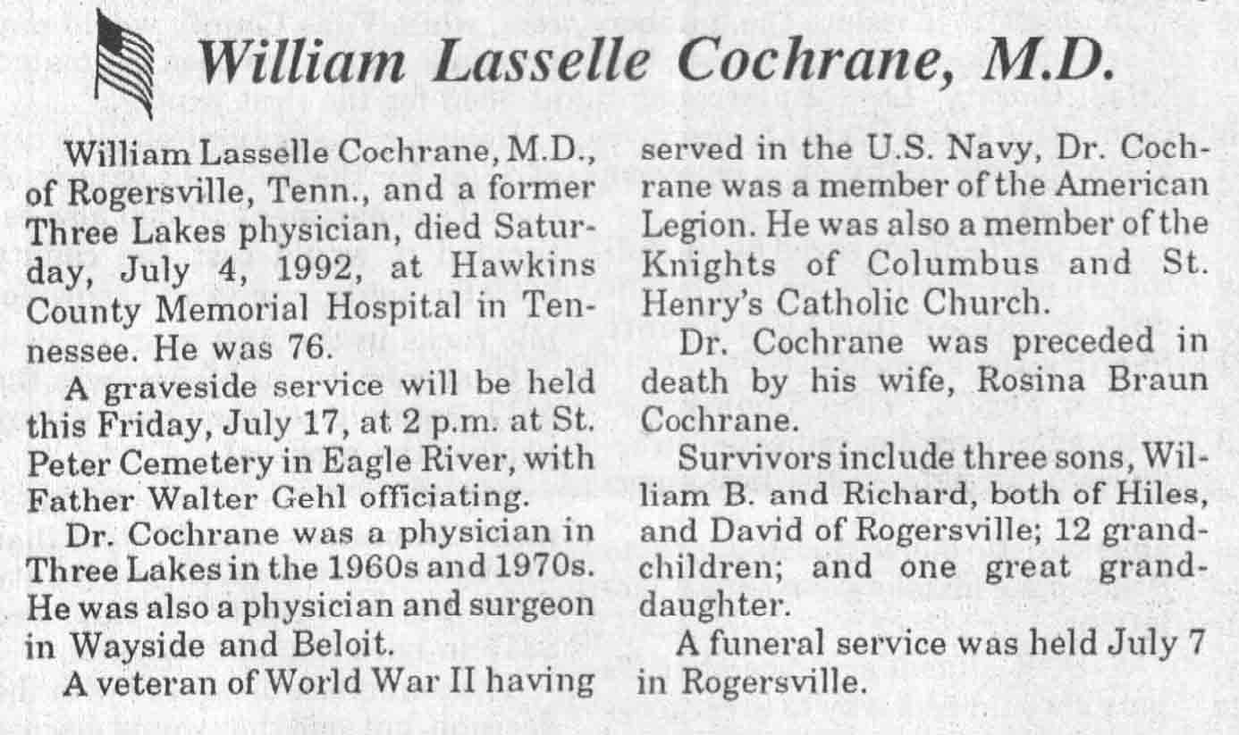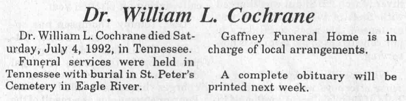 | Cochrane | William L, Dr #1 | 04 Jul 1992 | V N-R | 08 Jul 1992 | 4 | |