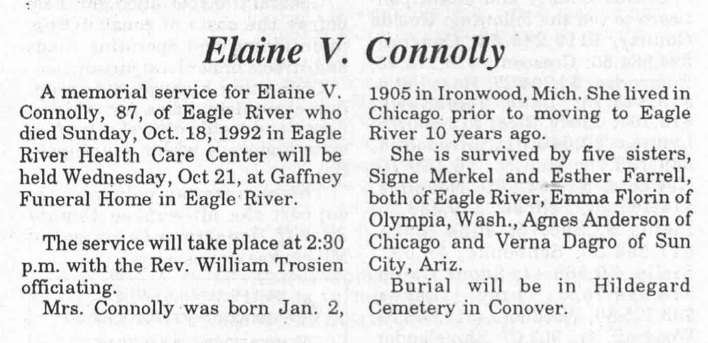 | Connolly | Elaine V | 02 Jan 1905 | 18 Oct 1992 | V N-R | 21 Oct 1992 | 4 |