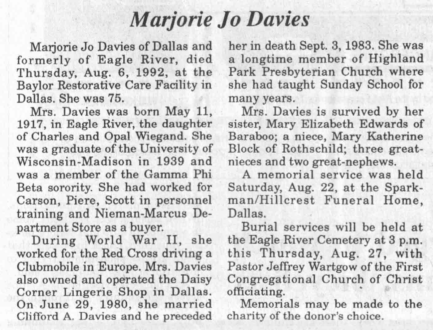 | Davies | Marjorie Jo | 11 May 1917 | 06 Aug 1992 | V N-R | 26 Aug 1992 | 4 |