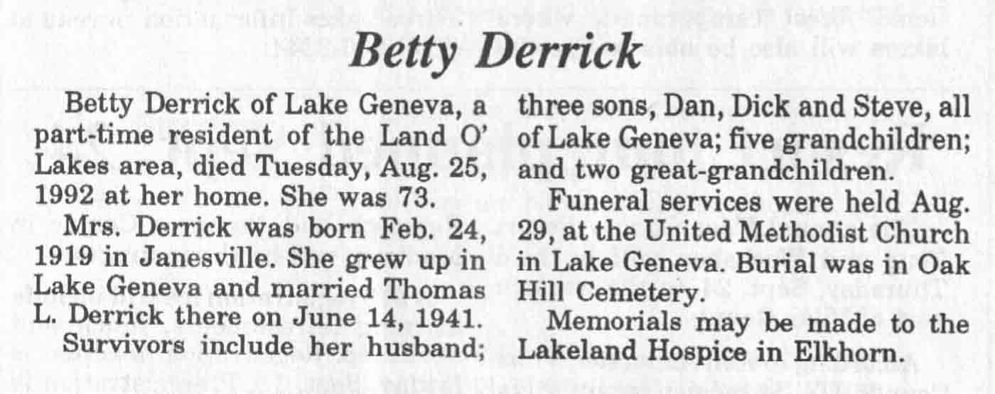 | Derrick | Betty | 24 Feb 1919 | 25 Aug 1992 | V N-R | 02 Sep 1992 | 4 |