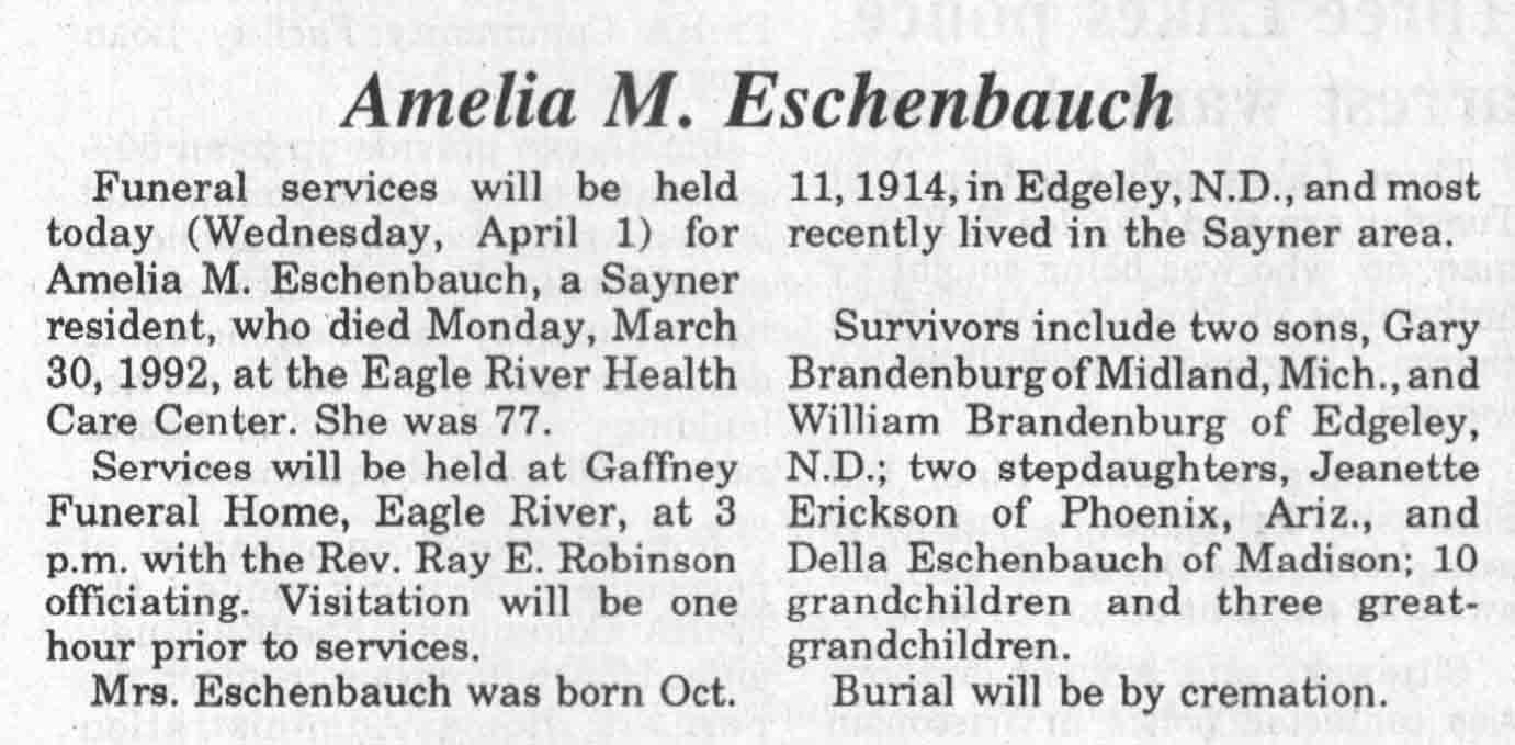 | Eschenbauch | Amelila M | 11 Oct 1914 | 30 Mar 1992 | V N-R | 01 Apr 1992 | 4 |