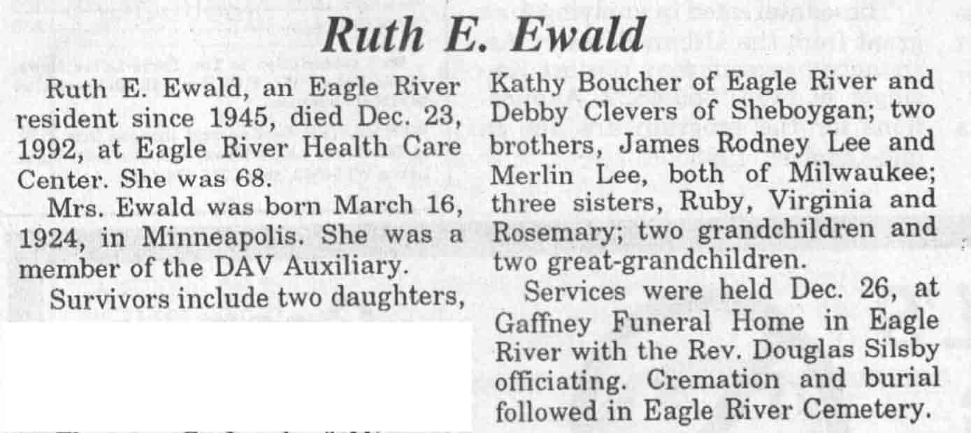 | Ewald | Ruth E | 16 Mar 1924 | 23 Dec 1992 | V N-R | 30 Dec 1992 | 4 |