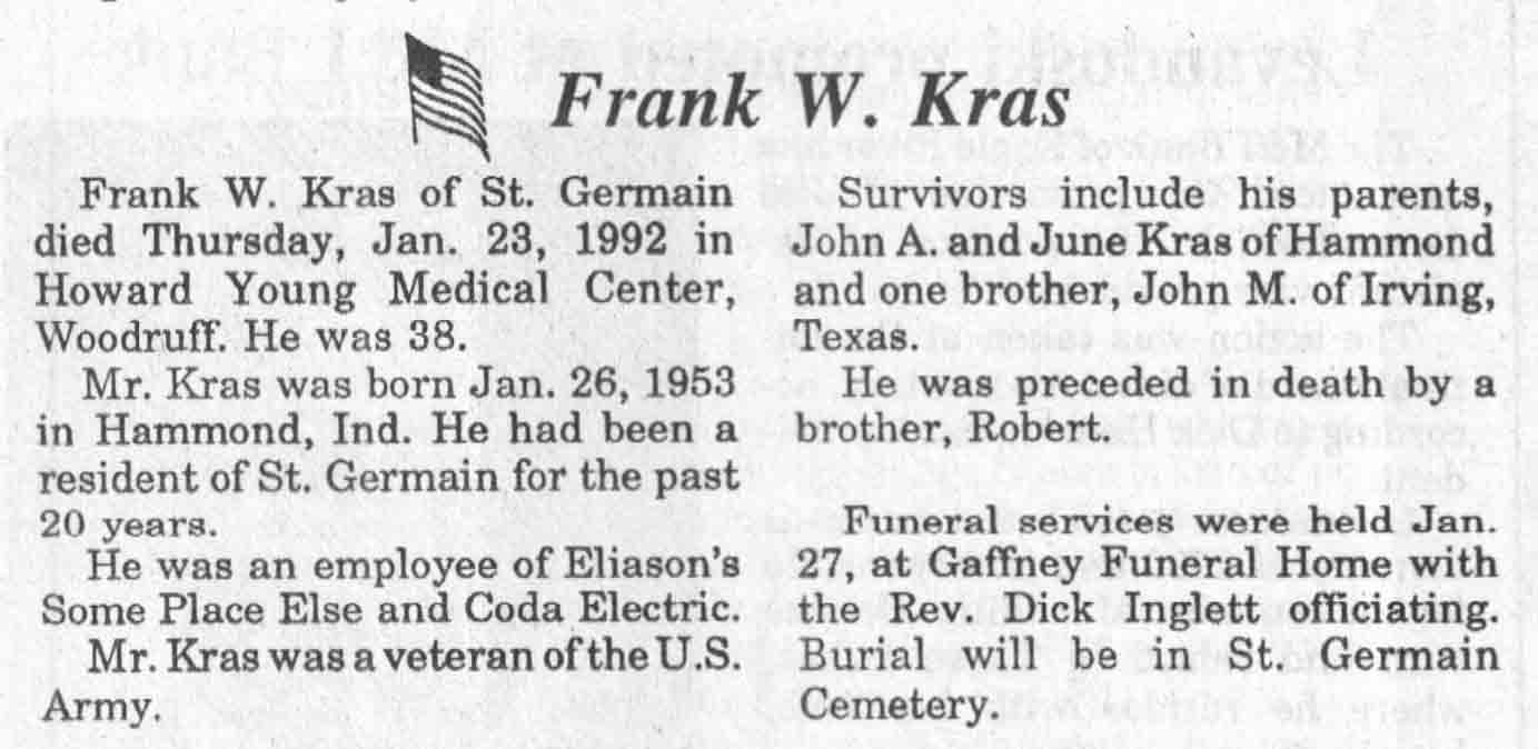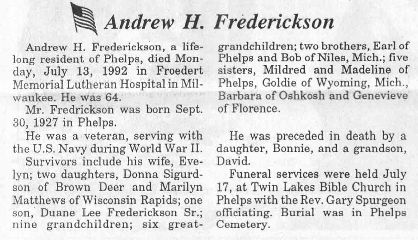 | Frederickson | Andrew H #2 | 30 Sep 1927 | 13 Jul 1992 | V N-R | 22 Jul 1992 | 8 |