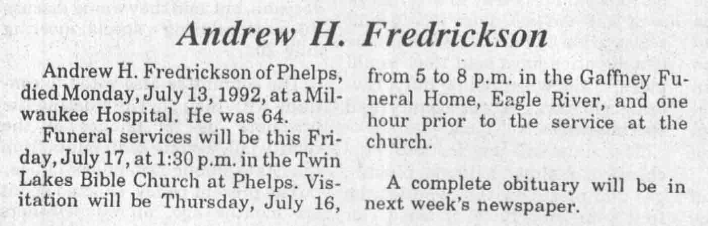 | Fredrickson | Andrew H #1 | 30 Sep 1927 | 13 Jul 1992 | V N-R | 15 Jul 1992 | 4 |