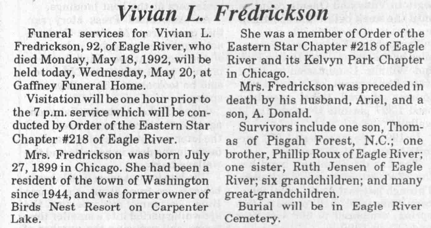 | Fredrickson | Vivian L | 27 Jul 1899 | 18 May 1992 | V N-R | 20 May 1992 | 4 |