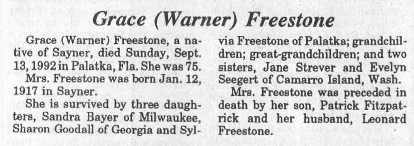 | Freestone | Grace (Warner) | 12 Jan 1917 | 13 Sep 1992 | V N-R | 16 Sep 1992 | 4 |