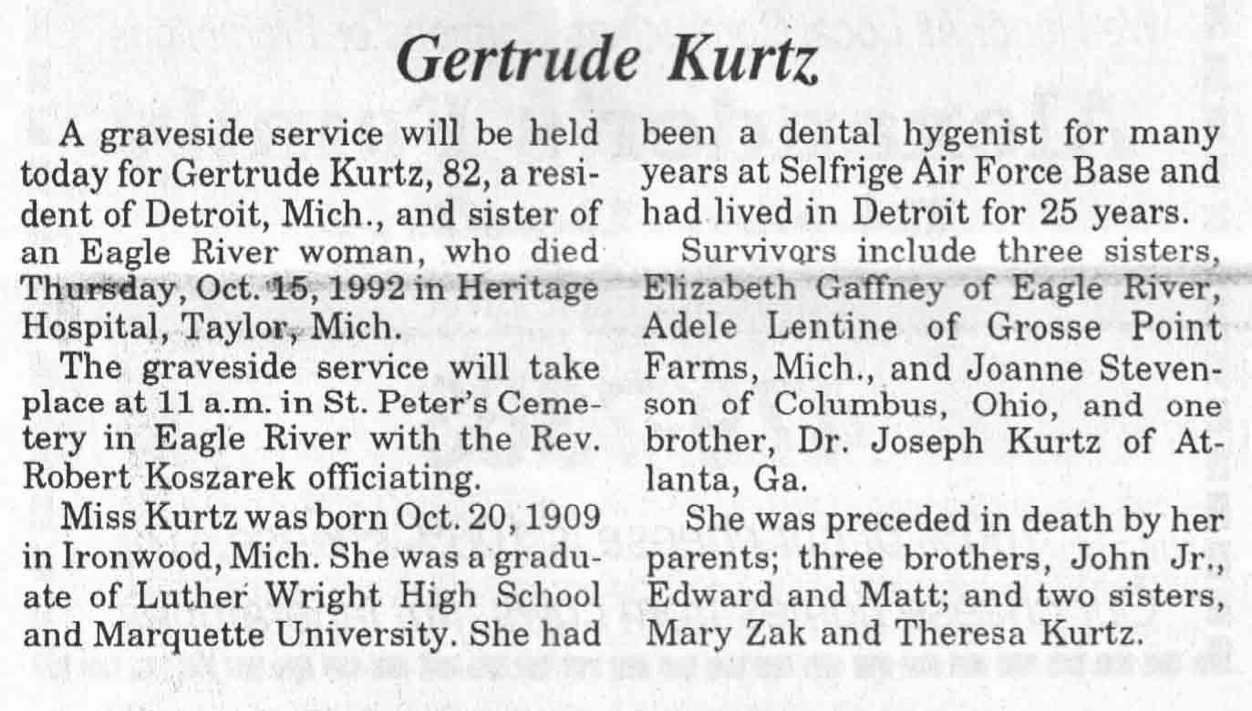 | Zdroik | Theresa C | 22 Dec 1903 | 28 Nov 1992 | V N-R | 09 Dec 1992 | 4 |