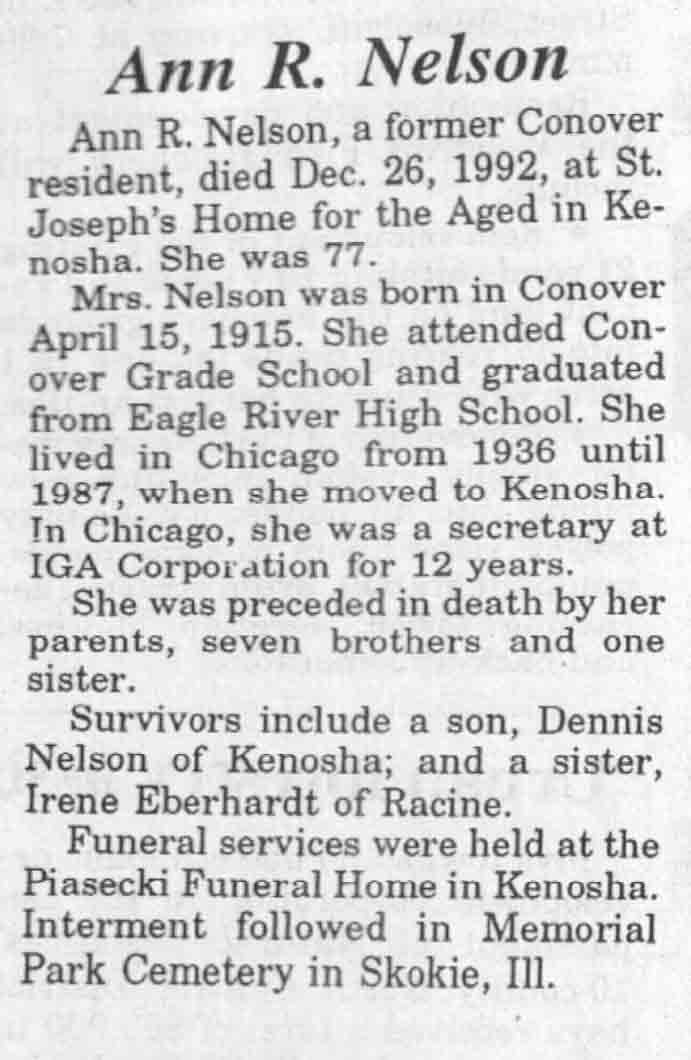 | Nelson | Ann R | 15 Apr 1915 | 26 Dec 1992 | V N-R | 30 Dec 1992 | 4 |