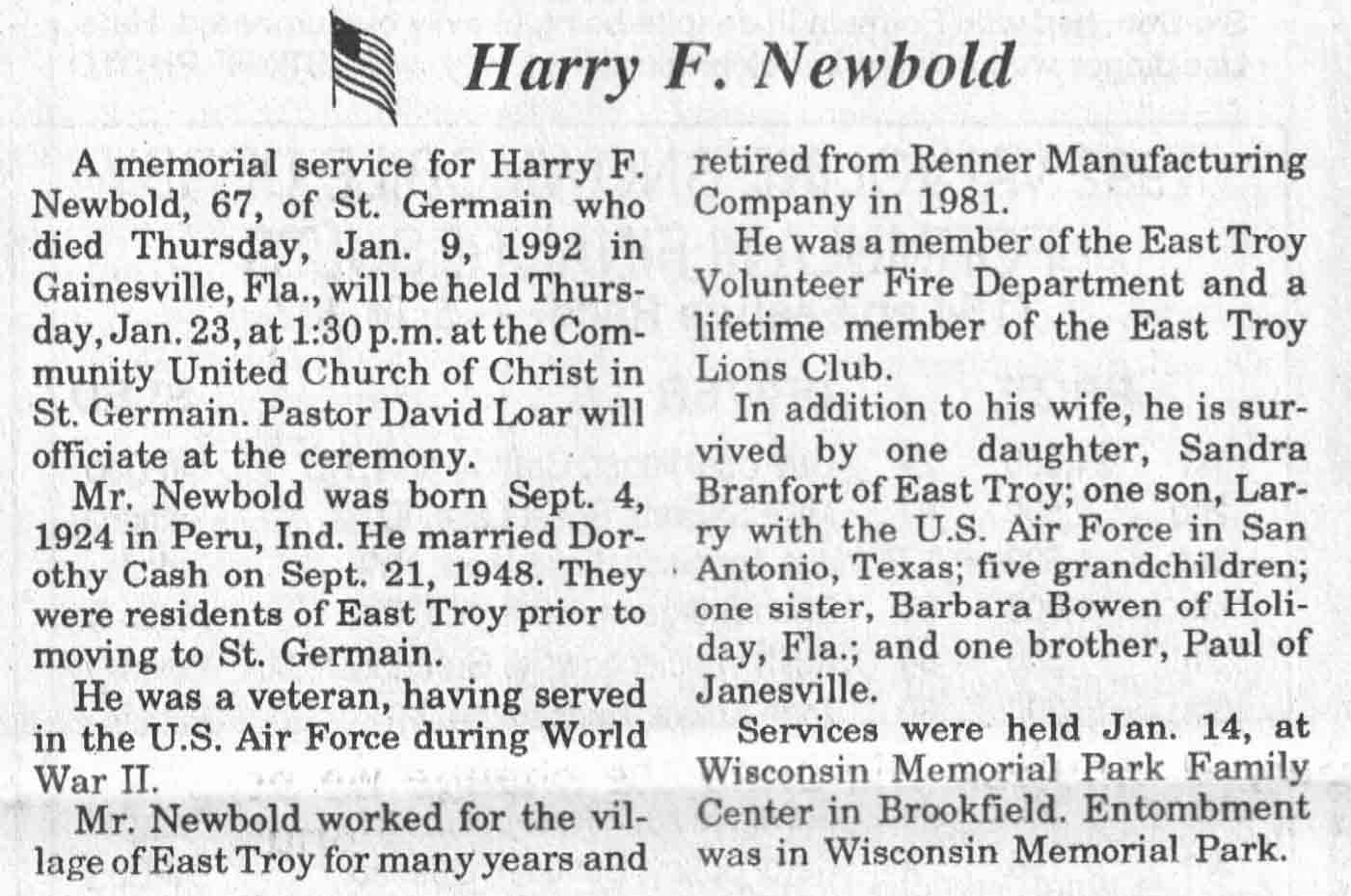 | Newbold | Harry F | 04 Sep 1924 | 09 Jan 1992 | V N-R | 22 Jan 1992 | 6 |