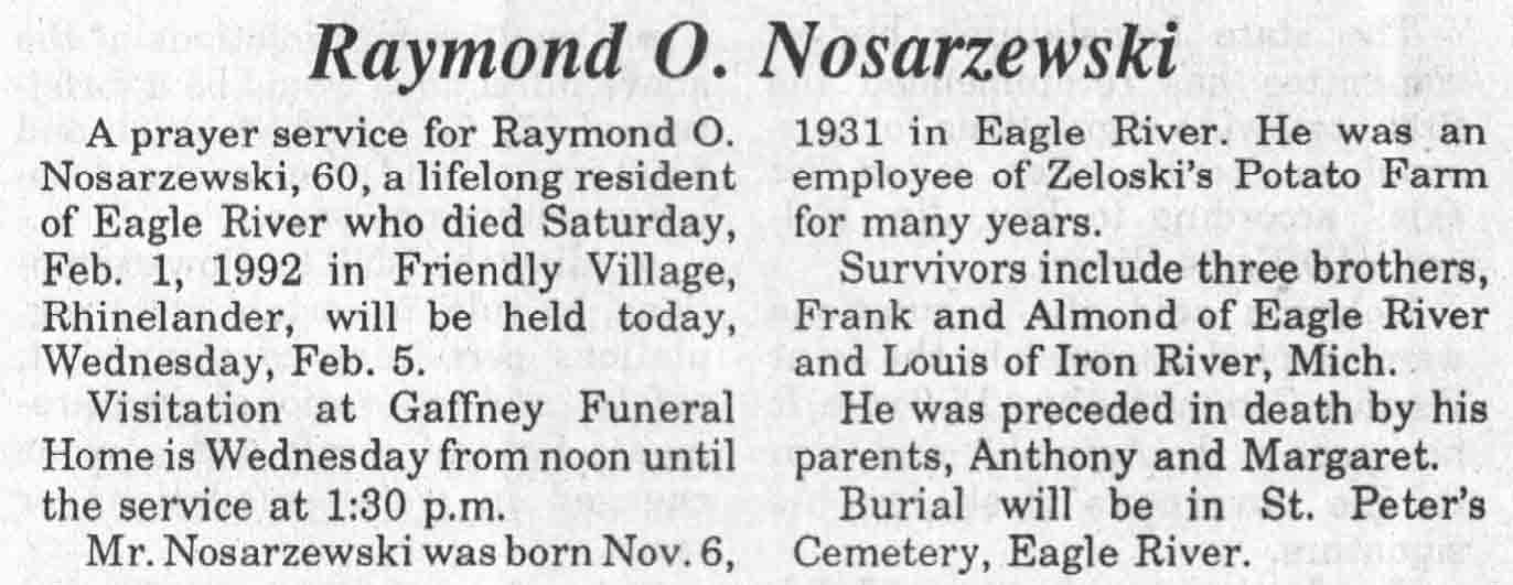 | Nosarzewski | Raymond O | 06 Nov 1931 | 01 Feb 1992 | V N-R | 05 Feb 1992 | 4 |