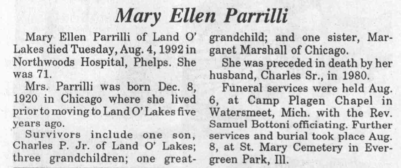 | Parrilli | Mary Ellen | 08 Dec 1920 | 04 Aug 1992 | V N-R | 12 Aug 1992 | 4 |