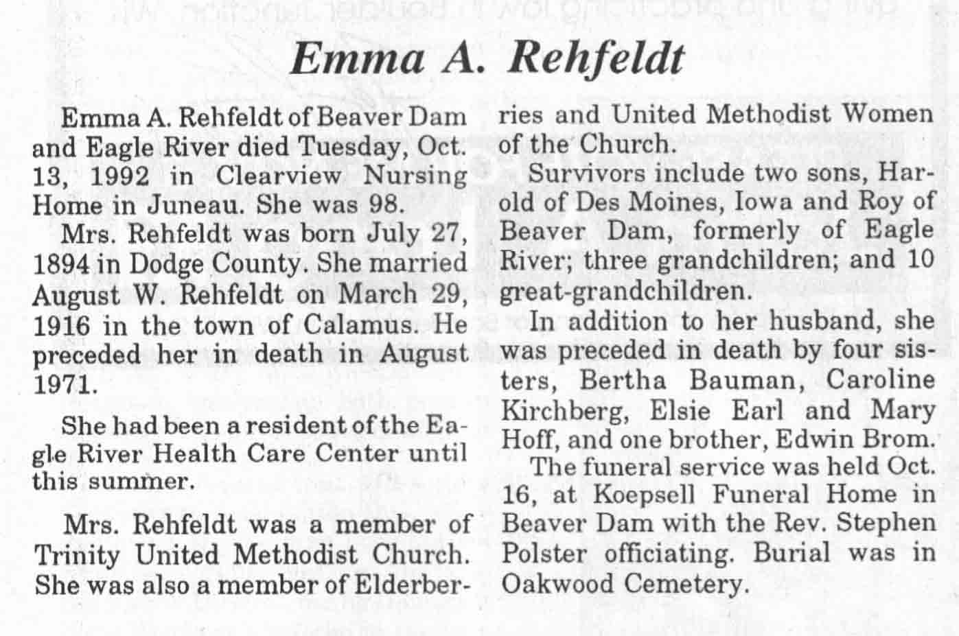 | Rehfeldt | Emma A | 27 Jul 1894 | 13 Oct 1992 | V N-R | 21 Oct 1992 | 4 |