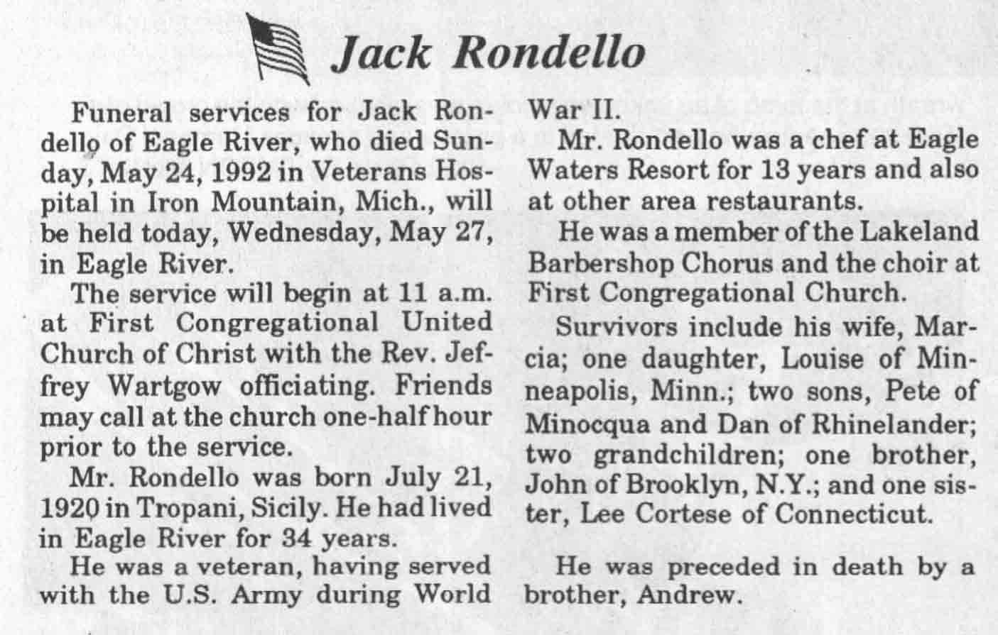 | Rondello | Jack | 21 Jul 1920 | 24 May 1992 | V N-R | 27 May 1992 | 4 |