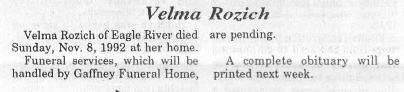 | Rozich | Velma O #2 | 23 Apr 1918 | 08 Nov 1992 | V N-R | 18 Nov 1992 | 4 |