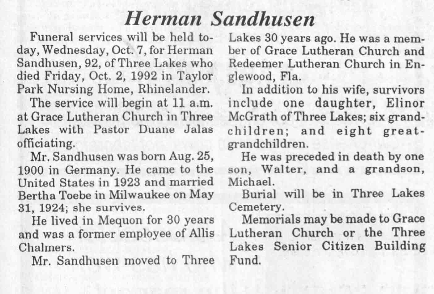 | Sandhusen | Herman | 25 Aug 1900 | 02 Oct 1992 | V N-R | 07 Oct 1992 | 4 |