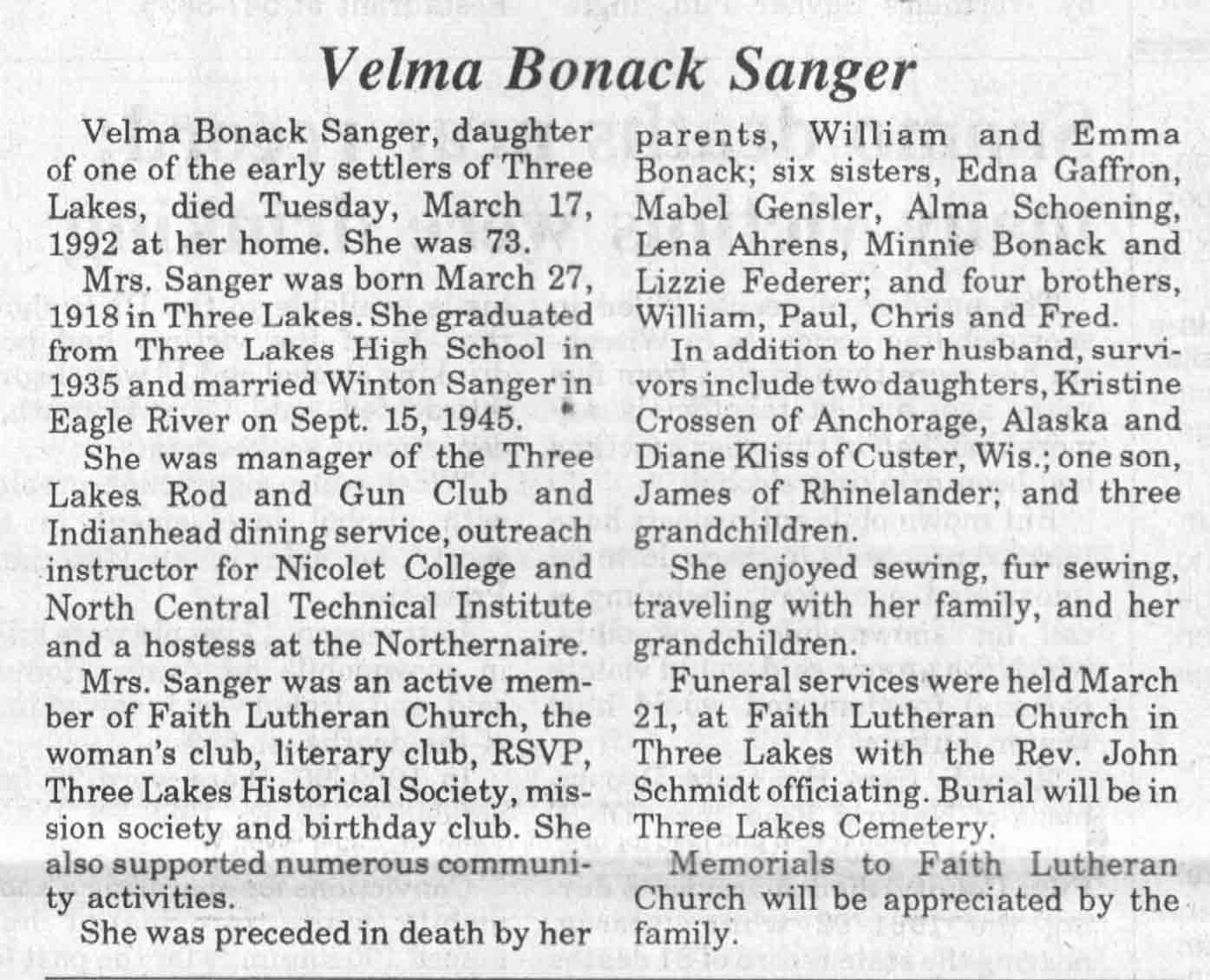 | Sanger | Velma (Bonack) | 27 Mar 1918 | 17 Mar 1992 | V N-R | 25 Mar 1992 | 4 |