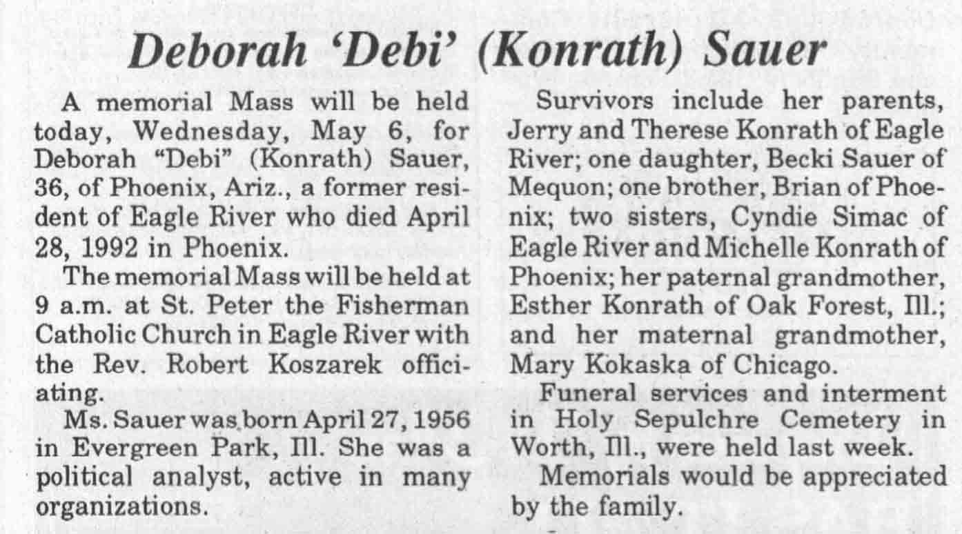 | Sauer | Deborah 'Debi' (Konrath) | 27 Apr 1956 | 28 Apr 1992 | V N-R | 06 May 1992 | 4 |