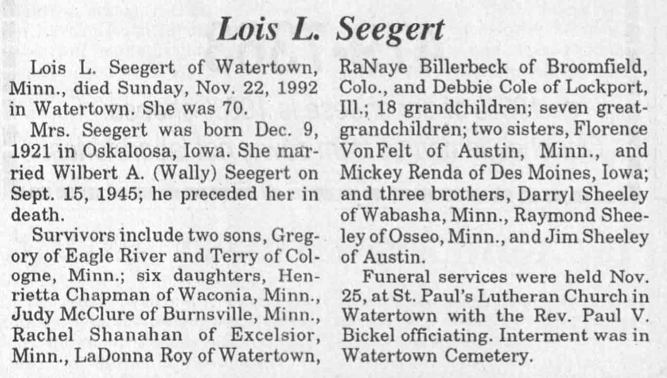 | Seegert | Lois L | 09 Dec 1921 | 22 Nov 1992 | V N-R | 02 Dec 1992 | 4 |