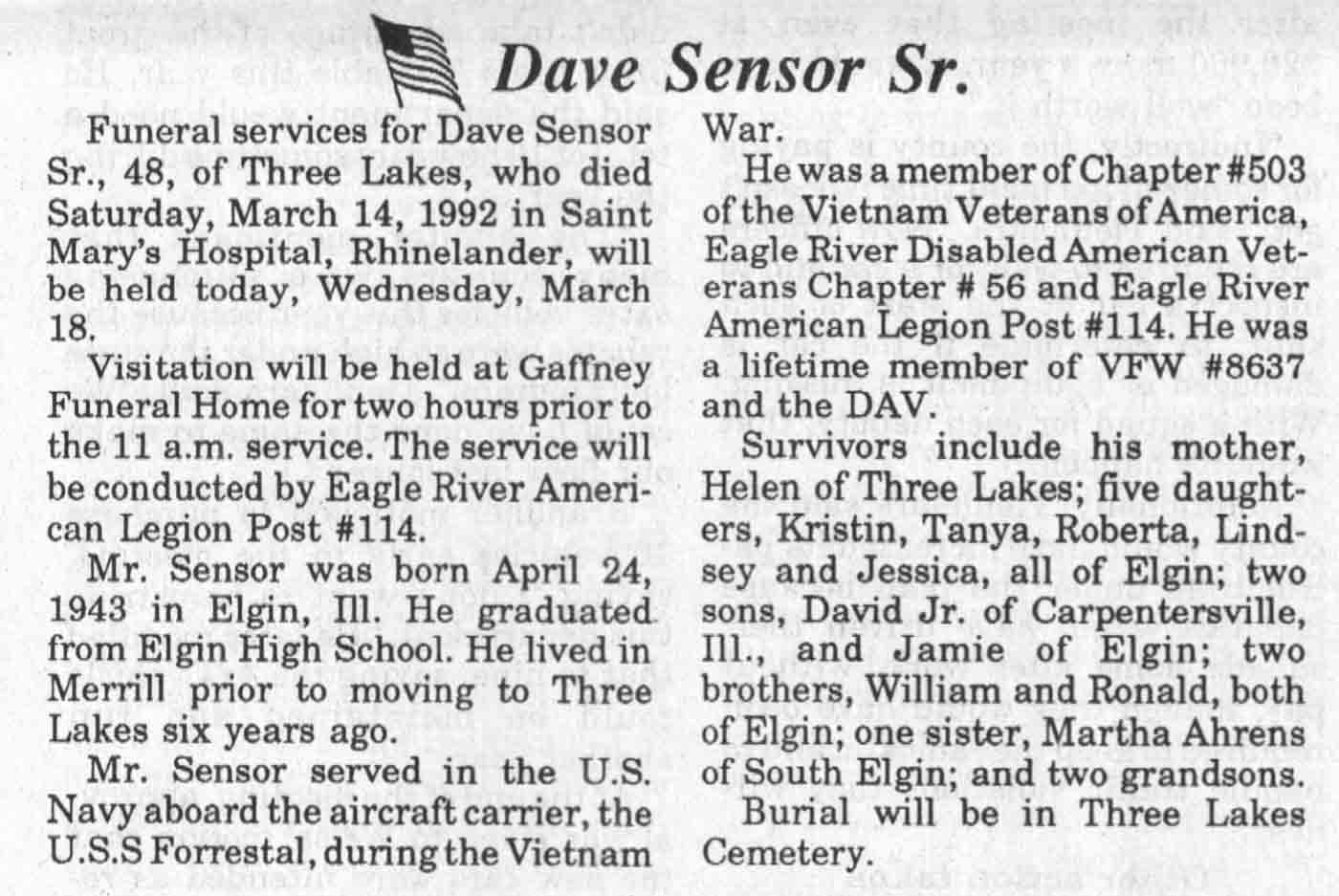 | Sensor | Dave, Sr | 24 Apr 1943 | 14 Mar 1992 | V N-R | 18 Mar 1992 | 4 |