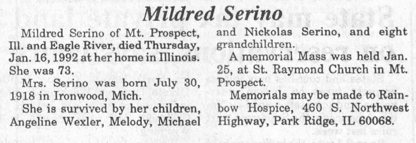 | Serino | Mildred | 30 Jul 1918 | 16 Jan 1992 | V N-R | 29 Jan 1992 | 4 |