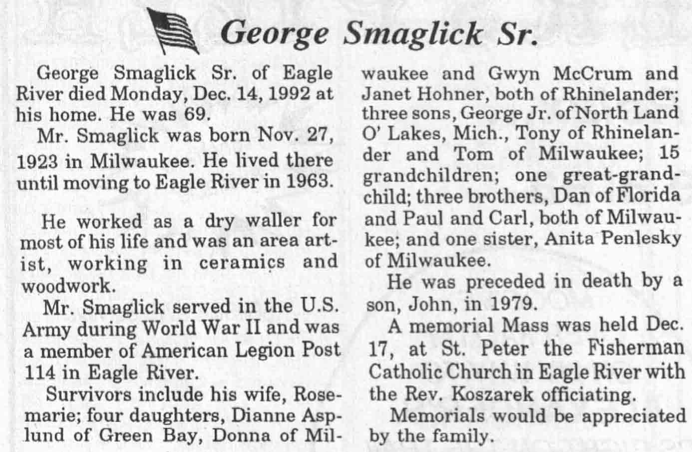 | Smaglick | George, Sr | 27 Nov 1923 | 14 Dec 1992 | V N-R | 23 Dec 1992 | 4 |