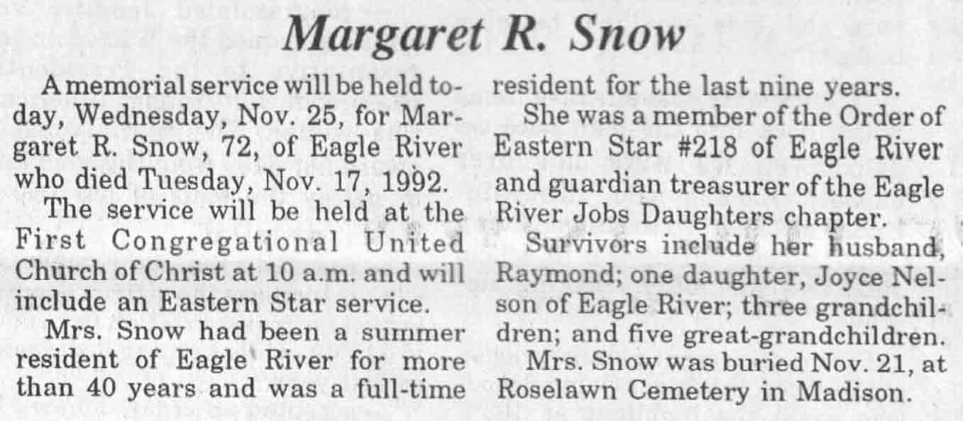 | Snow | Margaret R | c 1920 | 17 Nov 1992 | V N-R | 25 Nov 1992 | 4 |
