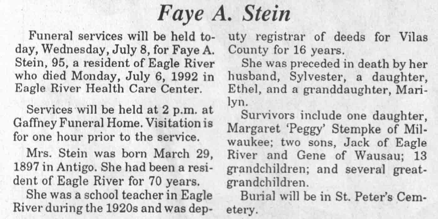 | Stein | Faye A | 29 Mar 1897 | 06 Jul 1992 | V N-R | 08 Jul 1992 | 4 |