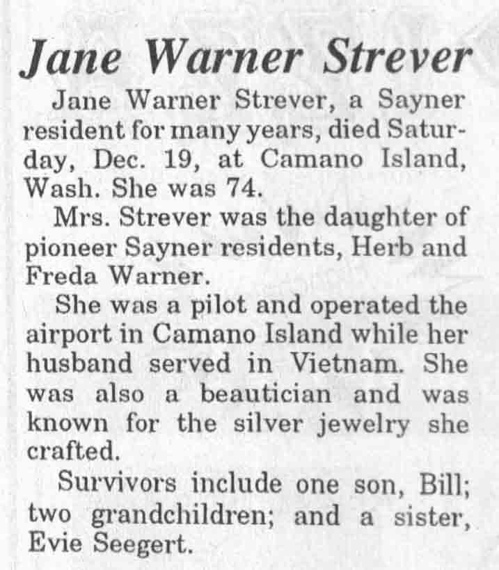 | Strever | Jane Warner | c 1918 | 19 Dec 1992 | V N-R | 30 Dec 1992 | 4 |
