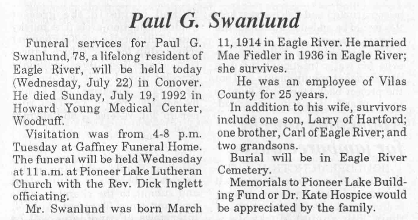 | Swanlund | Paul G | 11 Mar 1914 | 19 Jul 1992 | V N-R | 22 Jul 1992 | 8 |