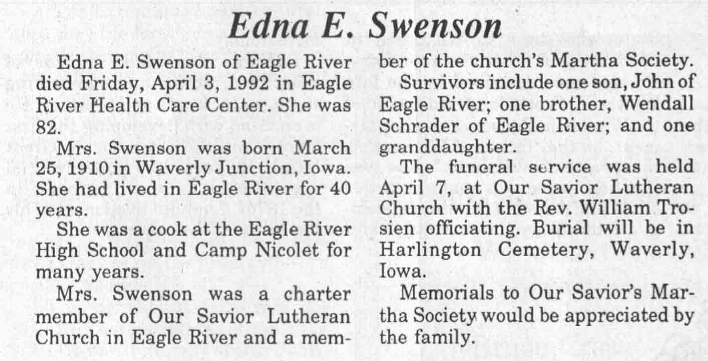 | Swenson | Edna E (Schrader) | 25 Mar 1910 | 03 Apr 1992 | V N-R | 08 Apr 1992 | 4 |