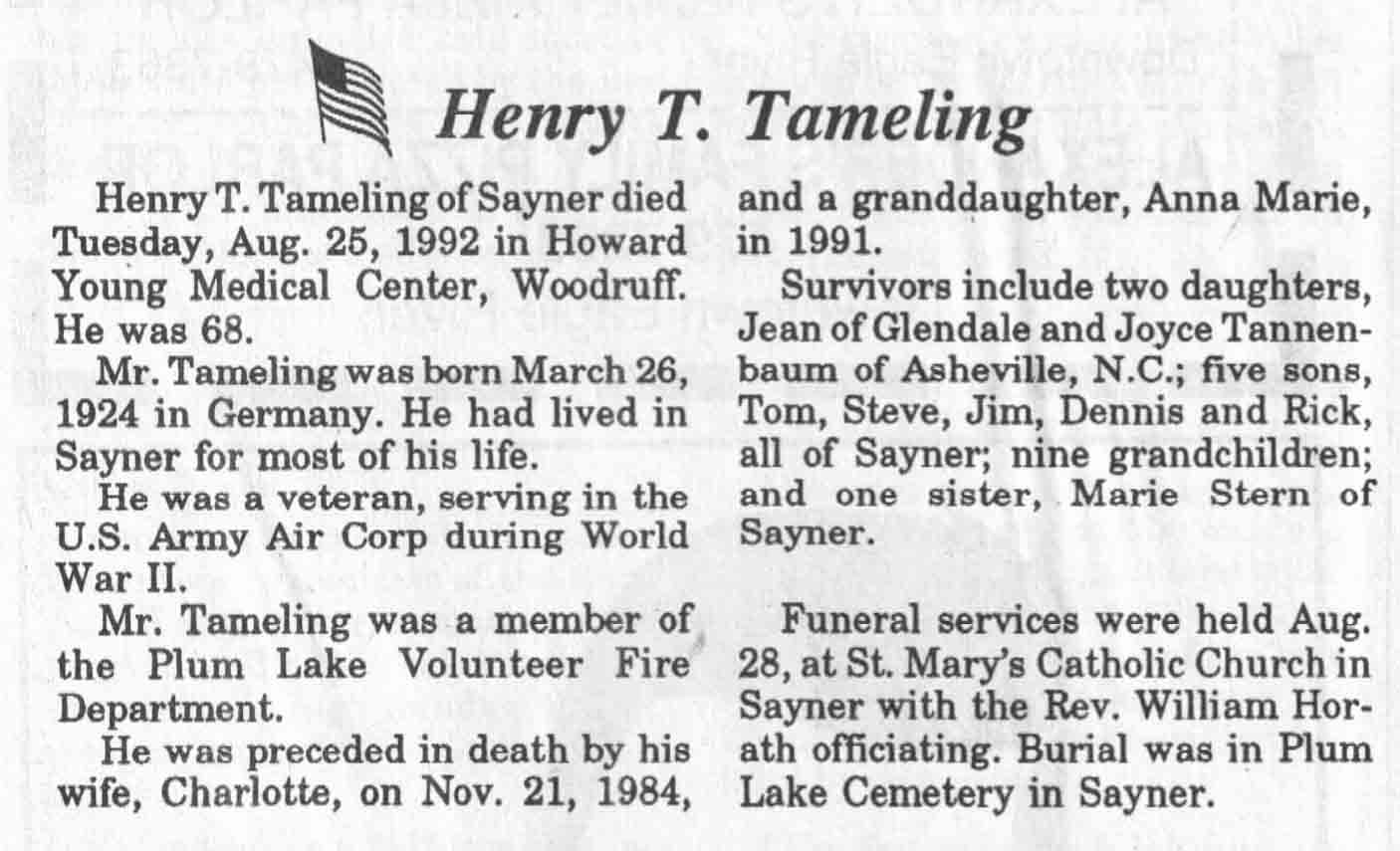 | Tameling | Henry T | 26 Mar 1924 | 25 Aug 1992 | V N-R | 02 Sep 1992 | 4 |