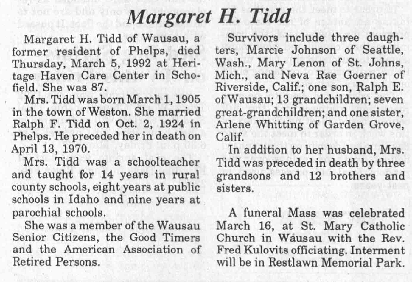 | Tidd | Margaret H | 01 Mar 1905 | 05 Mar 1992 | V N-R | 18 Mar 1992 | 4 |