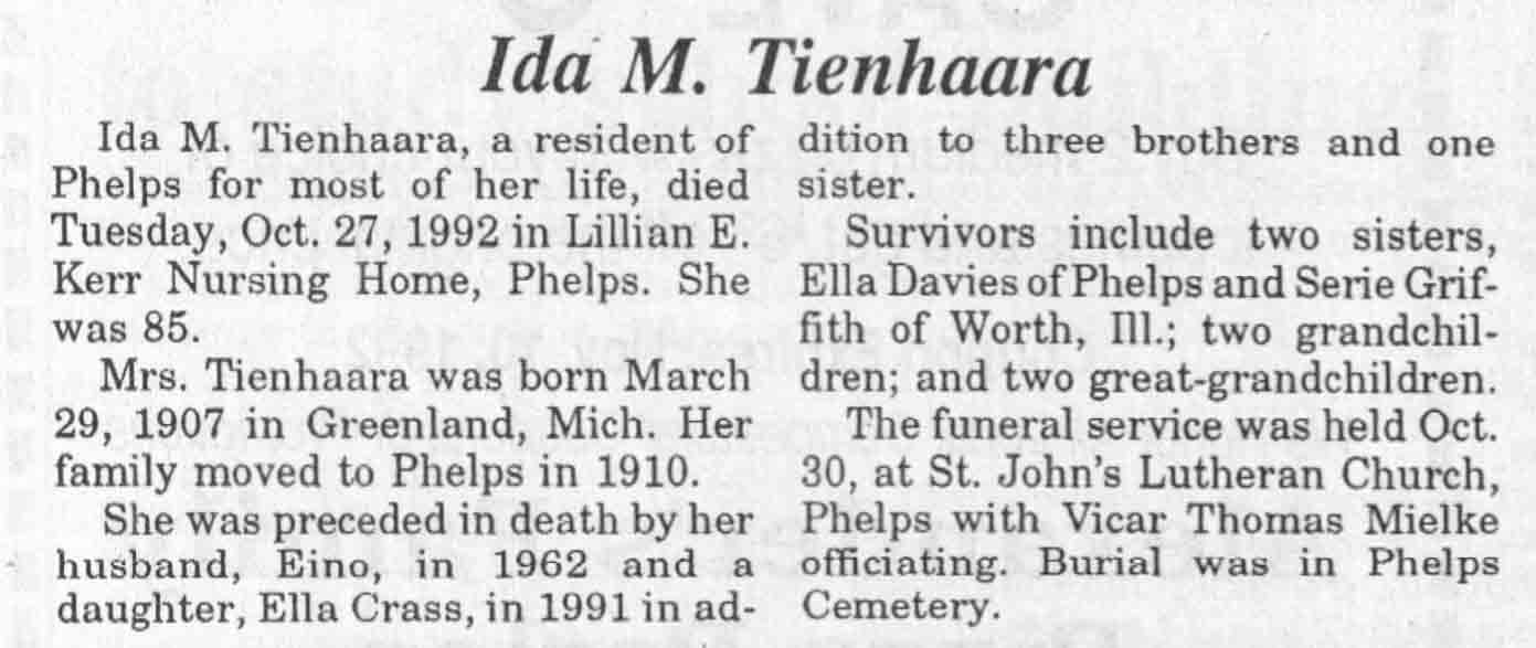 | Tienhaara | Ida M | 29 Mar 1907 | 27 Oct 1992 | V N-R | 04 Nov 1992 | 4 |