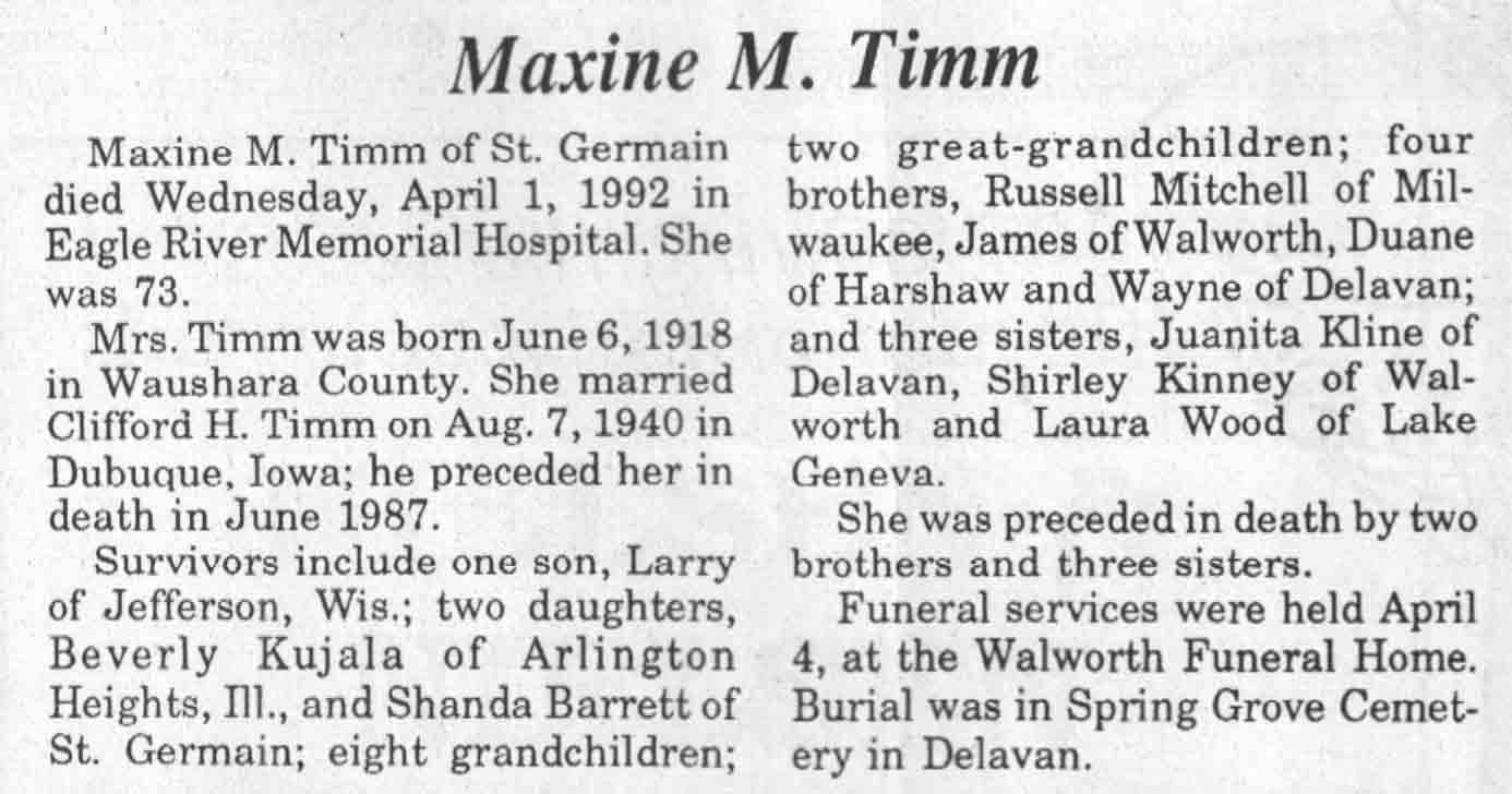 | Timm | Maxine M | 06 Jun 1918 | 01 Apr 1992 | V N-R | 08 Apr 1992 | 4 |