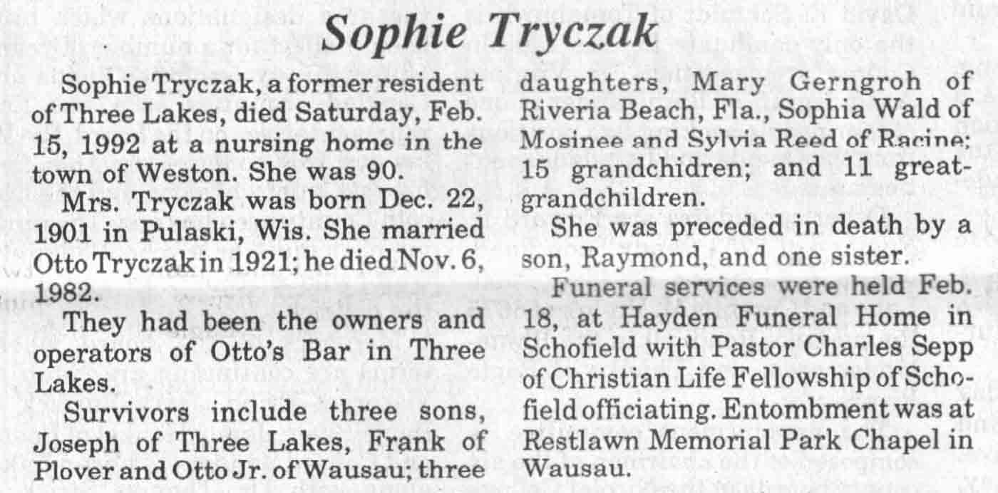 | Tryczak | Sophie | 22 Dec 1901 | 15 Feb 1992 | V N-R | 19 Feb 1992 | 4 |