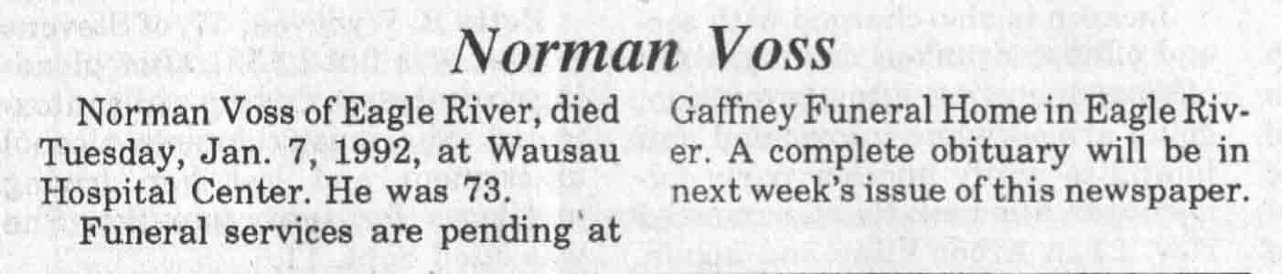 | Voss | Norman, Sr #2 | 05 Feb 1918 | 07 Jan 1992 | V N-R | 15 Jan 1992 | 8 |