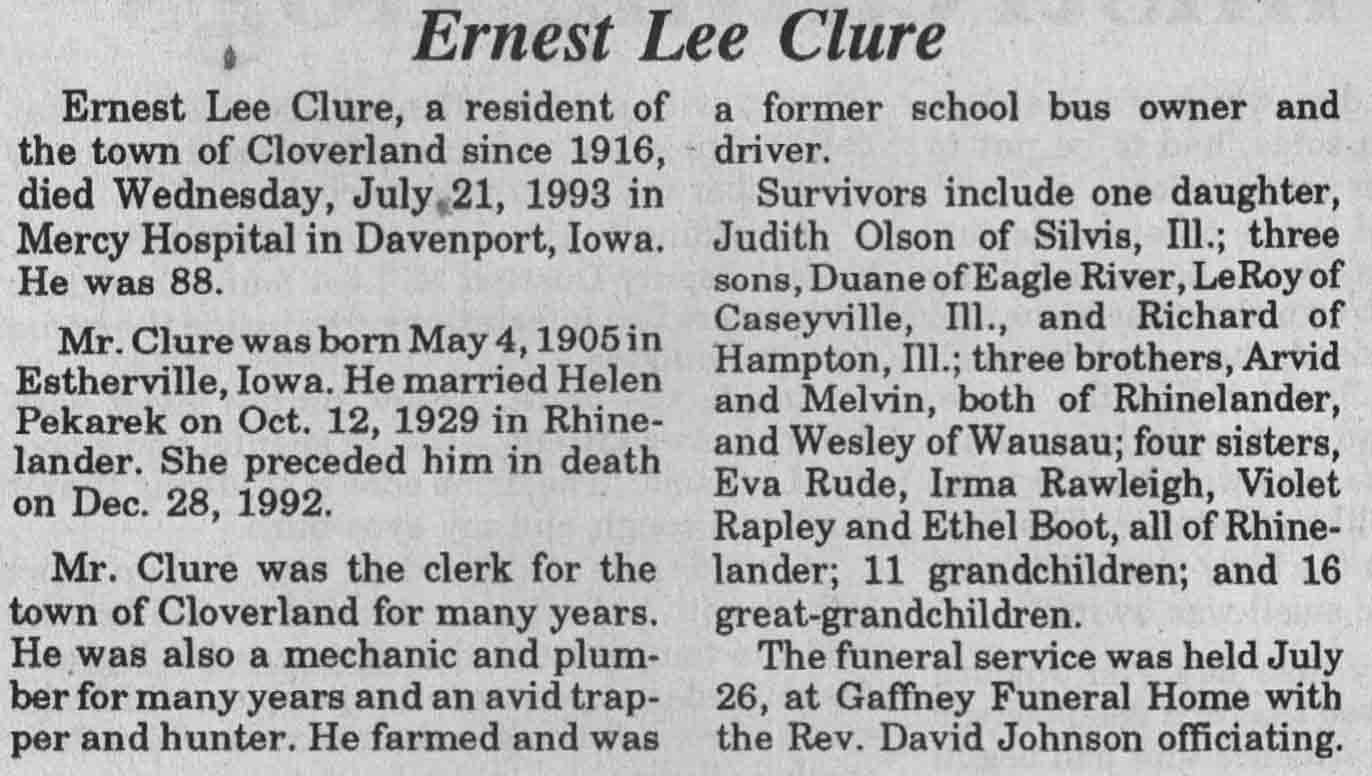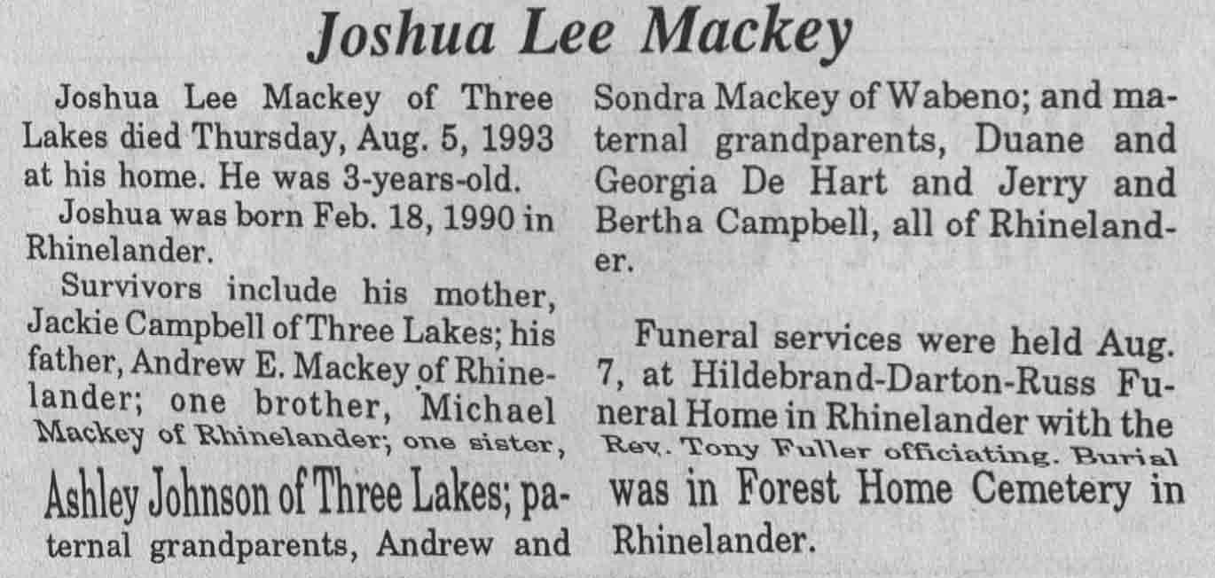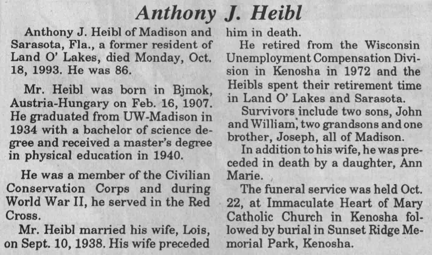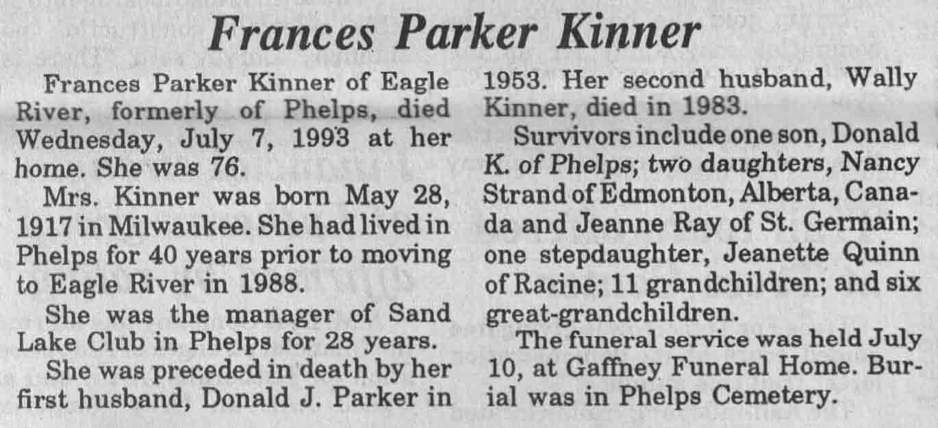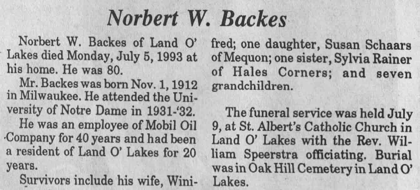 | Backes | Norbert W #1 | c 1913 | 05 Jul 1993 | V N-R | 07 Jul 1993 | 4 |