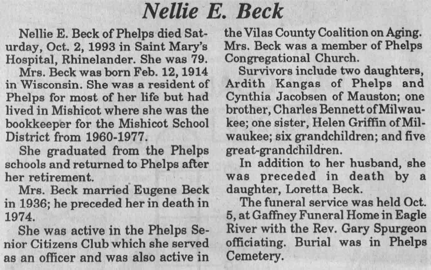 | Beck | Nellie E (Bennett) | 12 Feb 1914 | 02 Oct 1993 | V N-R | 06 Oct 1993 | 4 |