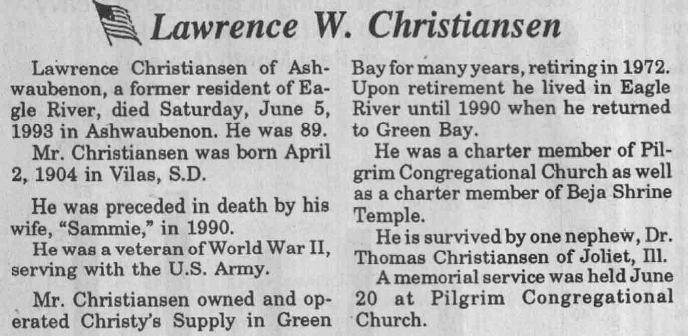 | Christiansen | Lawrence W | 02 Apr 1904 | 05 Jun 1993 | V N-R | 23 Jun 1993 | 4 |