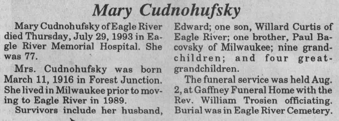 | Cudnohufsky | Mary (Bacovsky) | 11 Mar 1916 | 29 Jul 1993 | V N-R | 04 Aug 1993 | 4 |