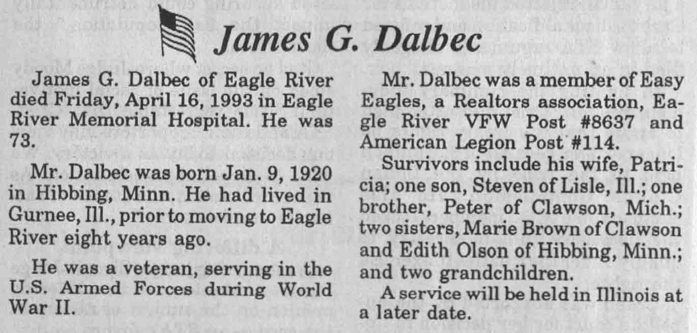 | Dalbec | James G | 09 Jan 1920 | 16 Apr 1993 | V N-R | 21 Apr 1993 | 4 |