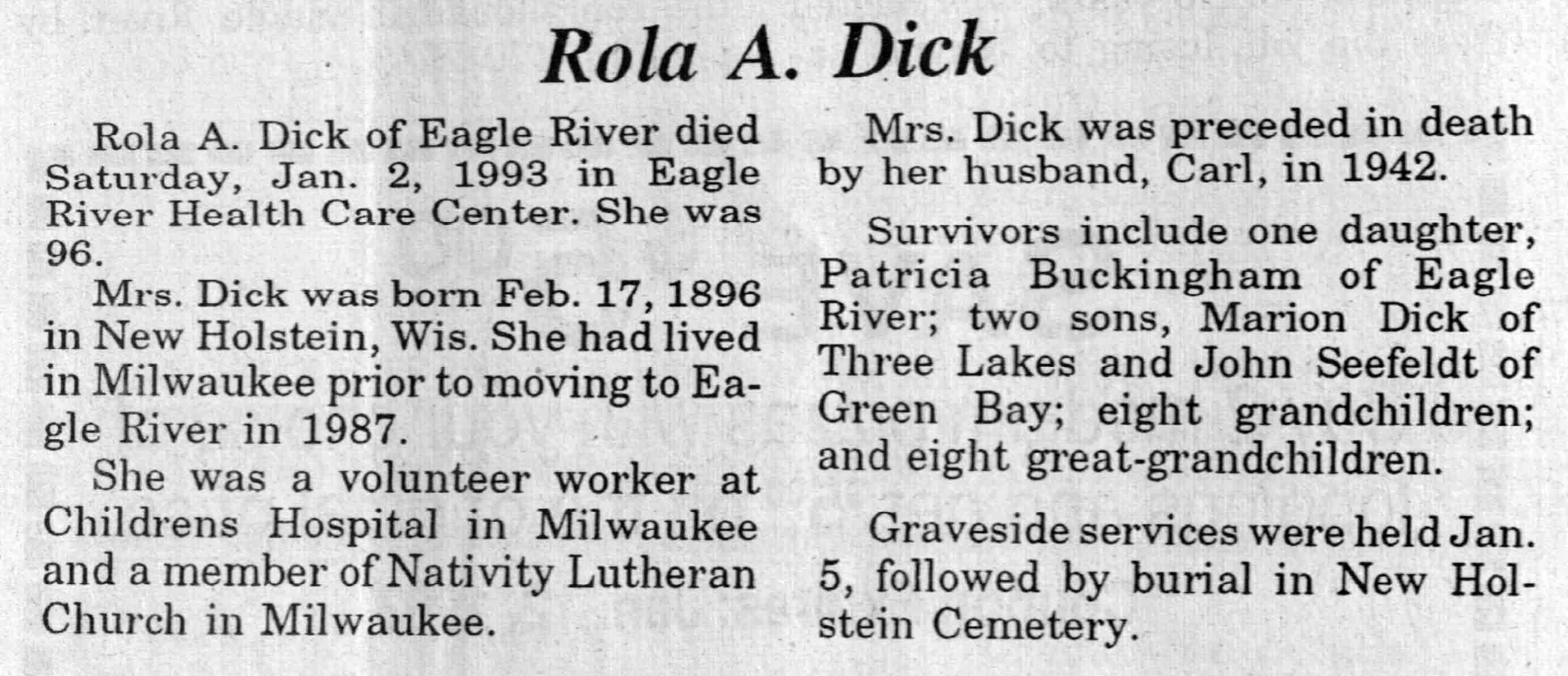 | Dick | Rola A | 17 Feb 1896 | 02 Jan 1993 | V N-R | 06 Jan 1993 | 4 |