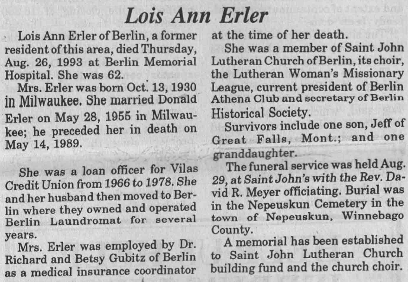 | Erler | Lois Ann | 13 Oct 1930 | 26 Aug 1993 | V N-R | 01 Sep 1993 | 4 |