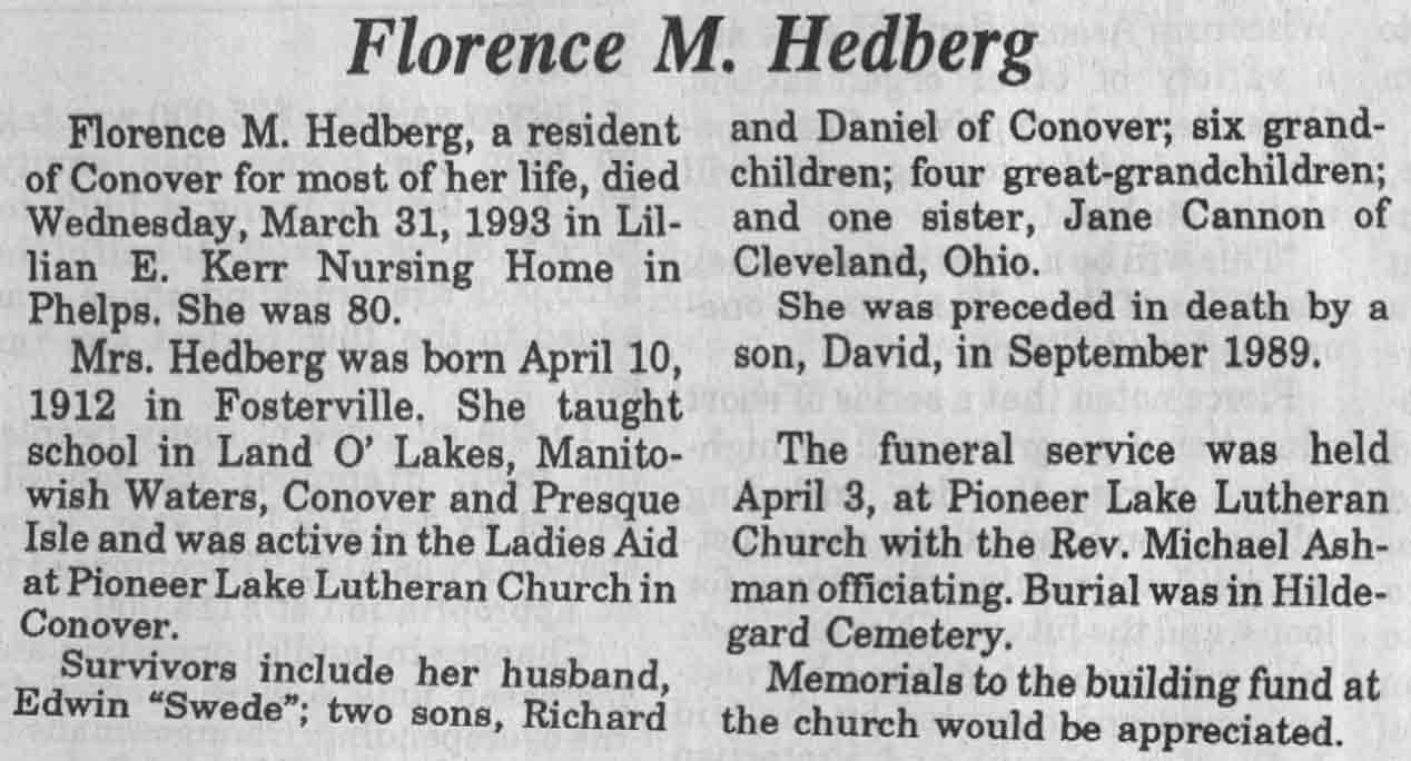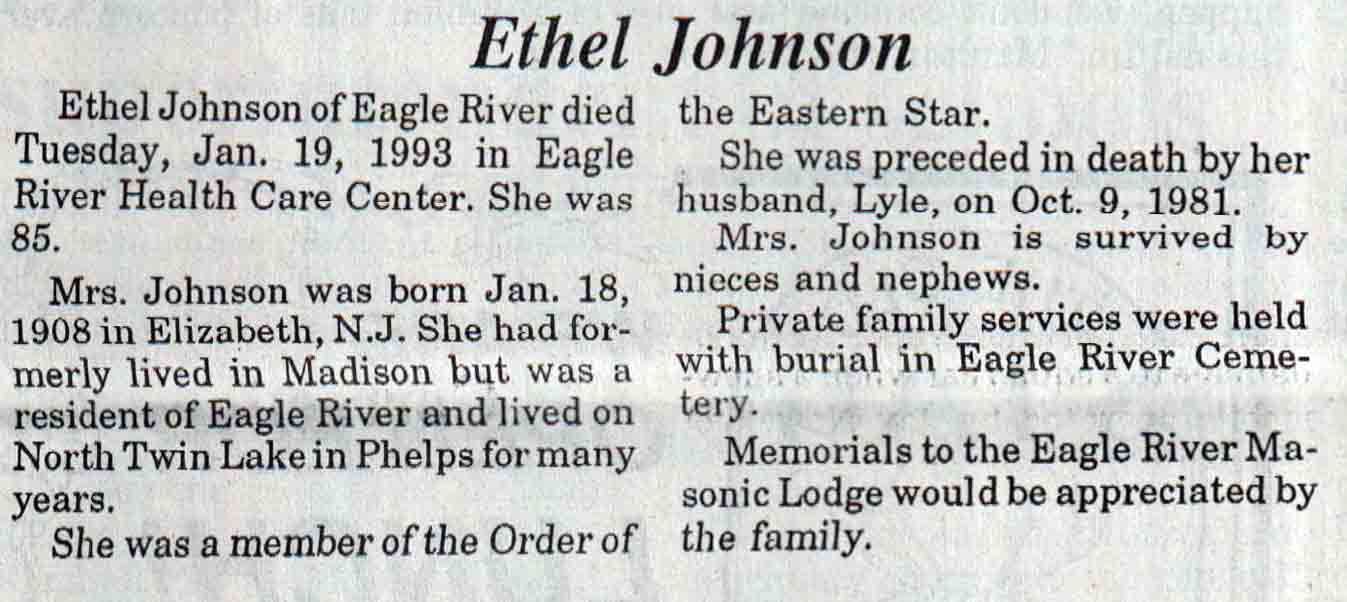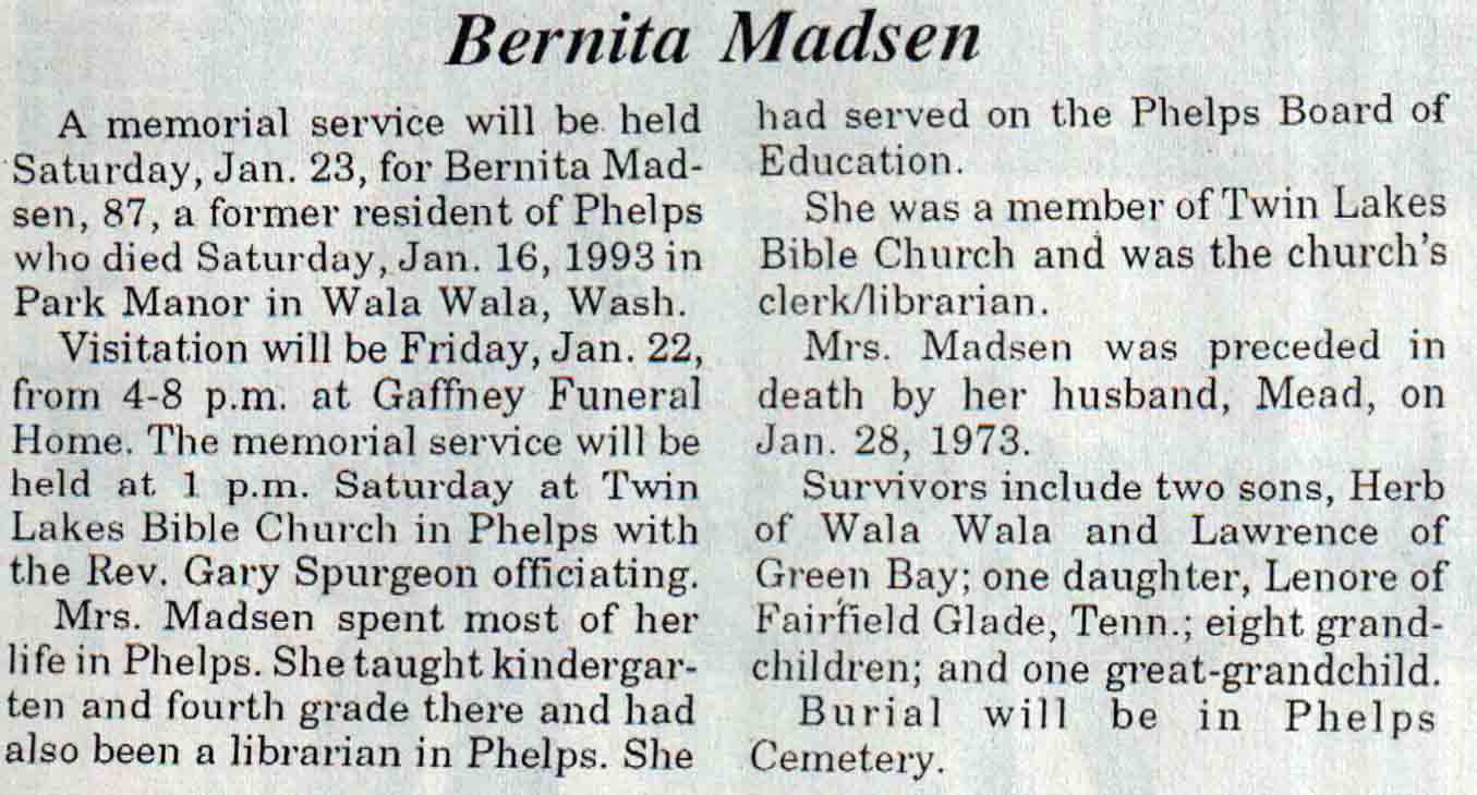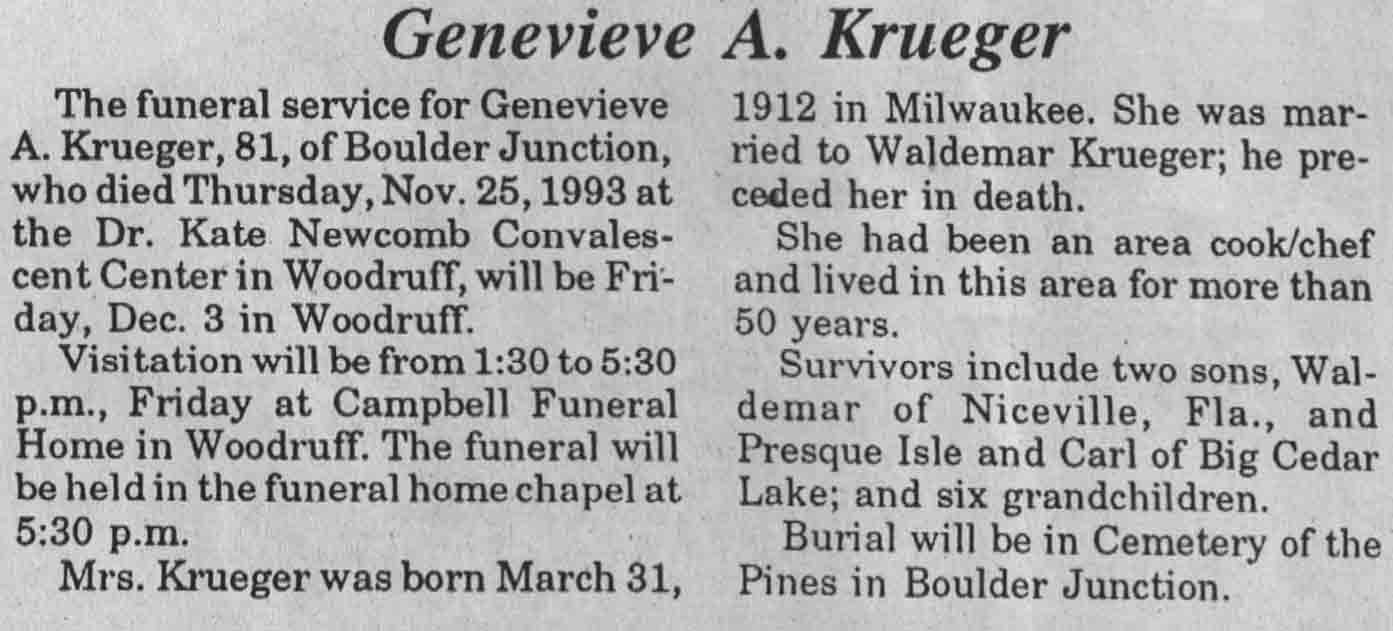 | Woodrow | Elvera A (Genzmer) | 21 Oct 1909 | 24 Nov 1993 | V N-R | 01 Dec 1993 | 4 |