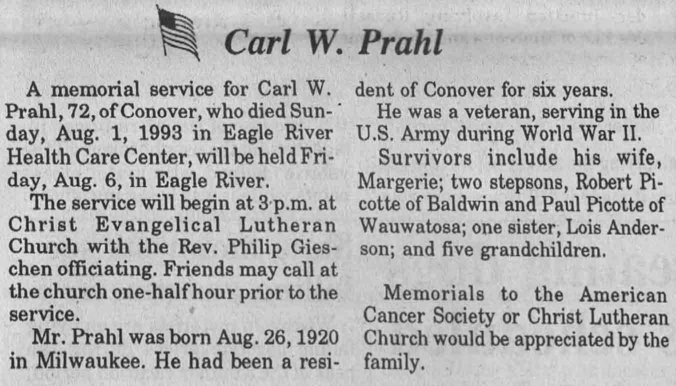 | Prahl | Carl W | 26 Aug 1920 | 01 Aug 1993 | V N-R | 04 Aug 1993 | 4 |