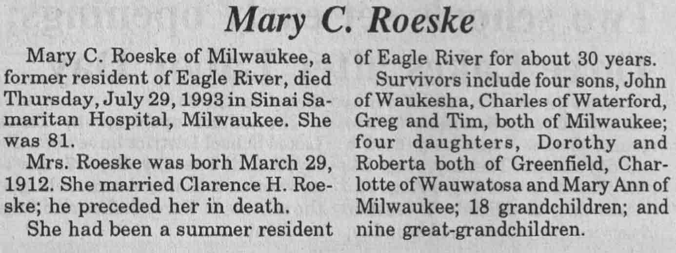 | Roeske | Mary C | 29 Mar 1912 | 29 Jul 1993 | V N-R | 11 Aug 1993 | 4 |