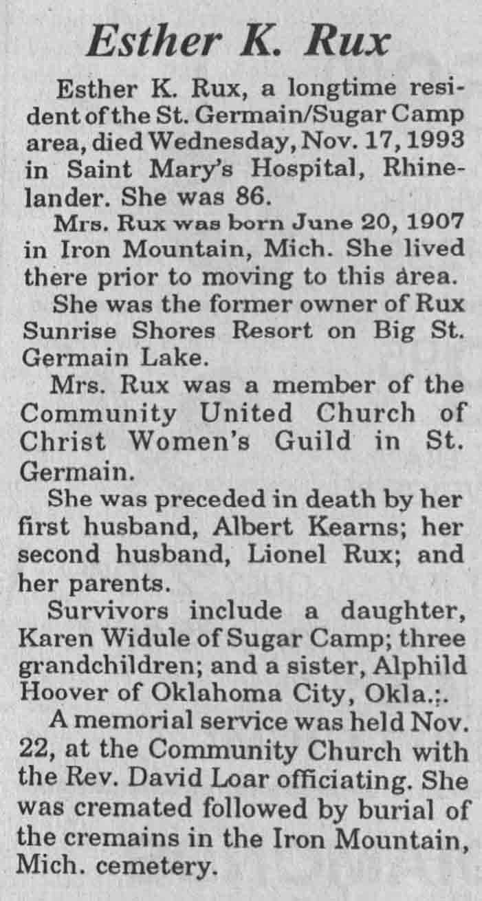 | Rux | Esther K | 20 Jun 1907 | 17 Nov 1993 | V N-R | 24 Nov 1993 | 4 |