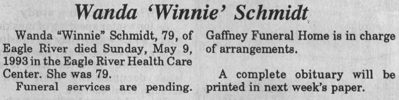 | Schmidt | Wanda 'Winnie' #1 | c 1914 | 09 May 1993 | V N-R | 12 May 1993 | 4 |